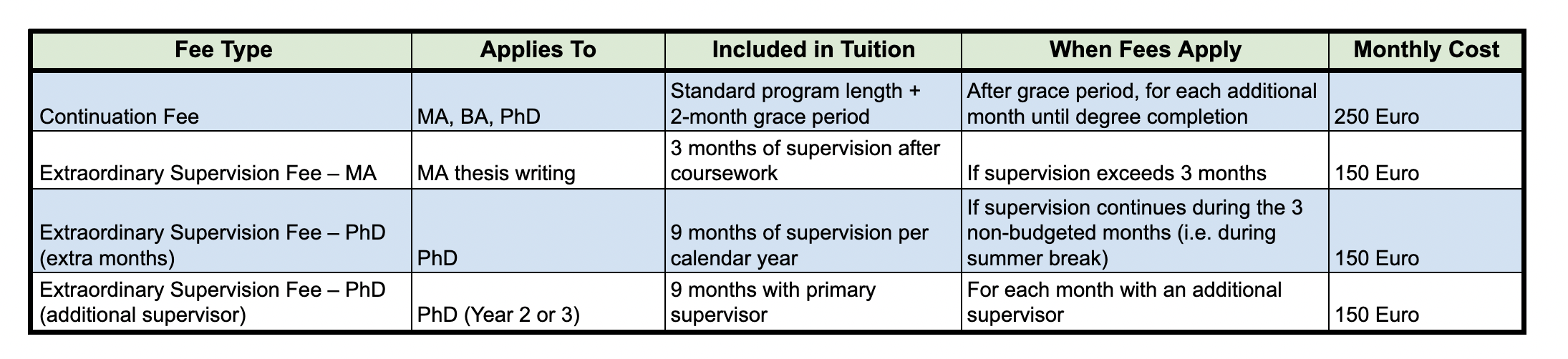 For example: If you are enrolled in a 12-month MA program and take 18 months to complete your degree, your two-month grace period covers months 13, 14 and 15. You would then be charged for months 16–18 (3 months × €250), resulting in an €750 continuation fee.
